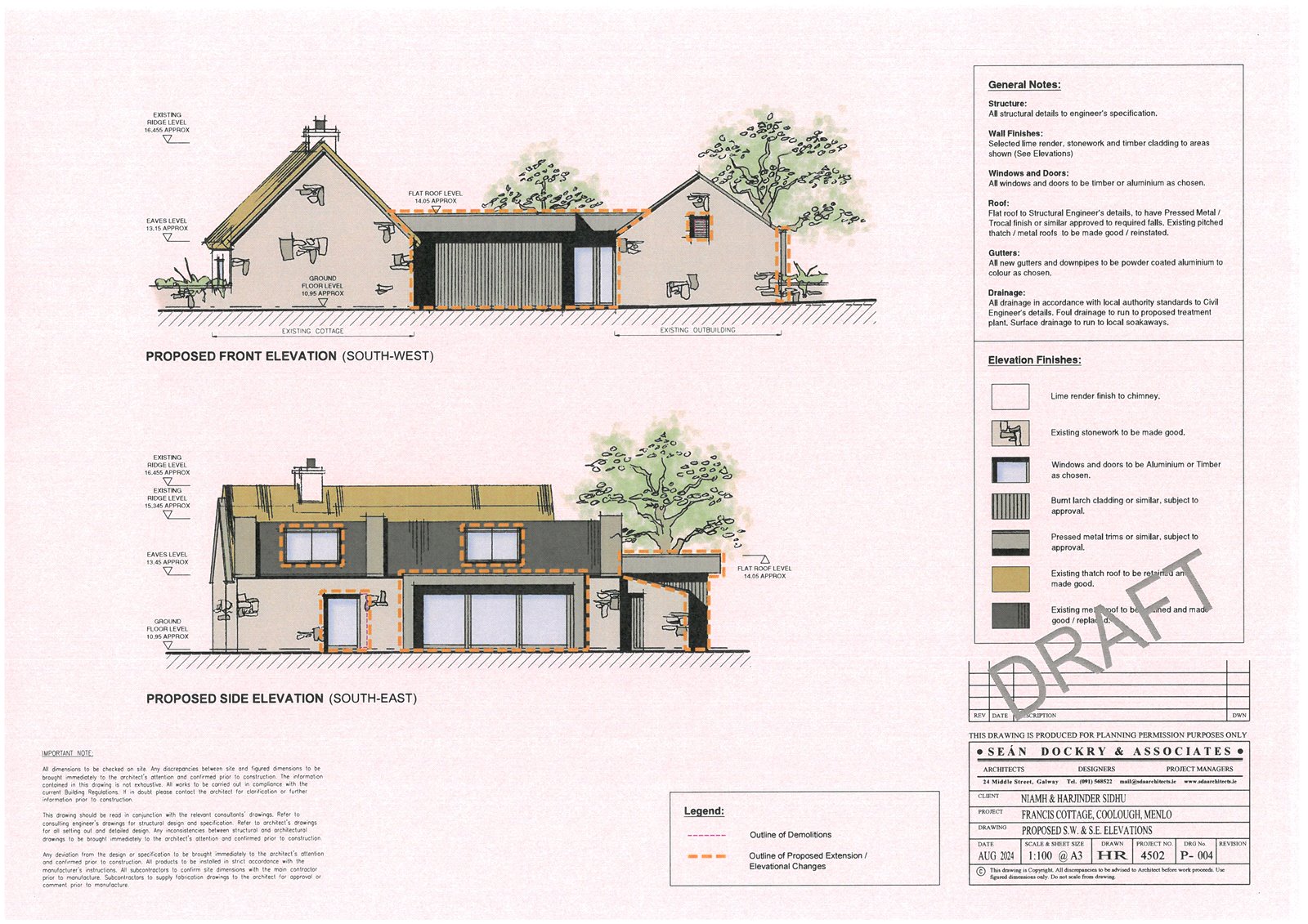 The cottage has grant of full planning permission on Galway City Council planning ref. 24/60291 for alterations to the existing dwelling including a new floor, energy upgrade items and elevational changes as well as the construction of a single storey link extension of 49 sq.m. and the refurbishment of an existing stone outbuilding of 60 sq.m. for residential use.